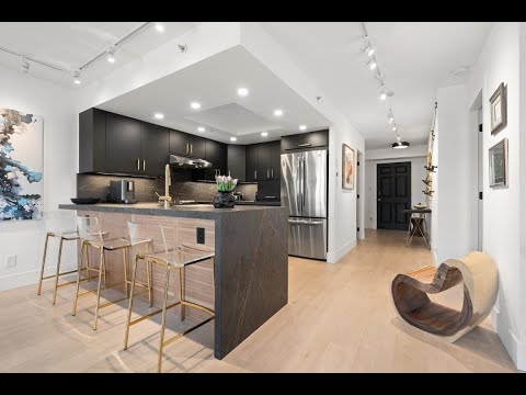 Experience luxury living in this completely remodelled False Creek gem with sweeping water & city views! Just steps to Olympic Village, the Seawall, & Main St SkyTrain, this 1091 sqft 2-bed, 2-bath home offers wide-plank white oak engineered hardwood floors throughout the suite, smart lighting, & motorized blinds ! The designer kitchen dazzles with high quality Dekton countertops with waterfall edge and backsplash, sleek black cabinets & gold hardware! Retreat to your spacious primary suite feats double closets & a fully renovated spa-like 5-piece ensuite with NuHeat floors. Enjoy indoor-outdoor living on the 130 sqft covered balcony facing West for gorgeous City & water views! 2 parking (1 EV) & locker. Pet-friendly building with fantastic amenities including pool, gym, hot tub & sauna!
